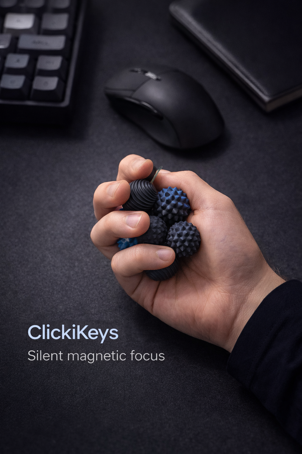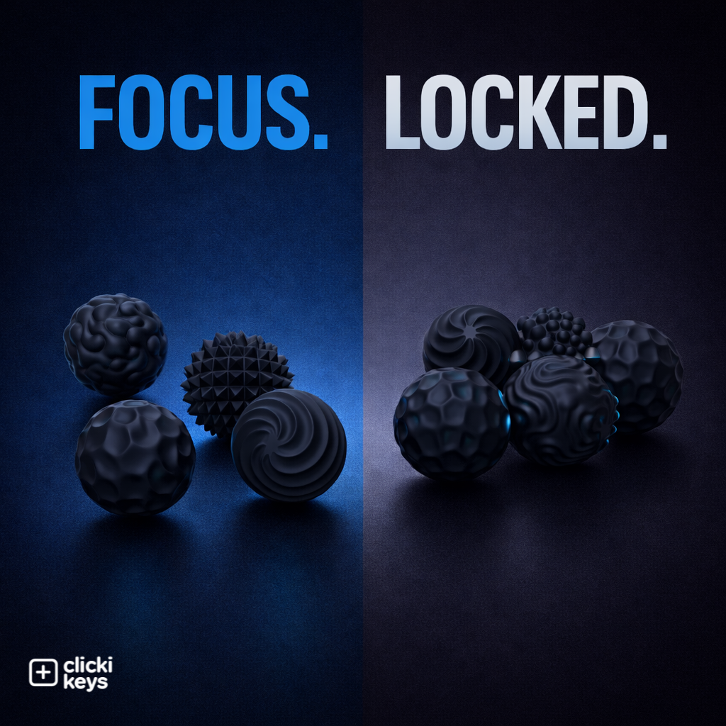 ClickiKeys silent magnetic fidget is designed to help you focus, unwind, and stay present. With a precision magnetic core and six tactile textures, it transforms restless energy into calm, controlled motion — without noise or distraction.